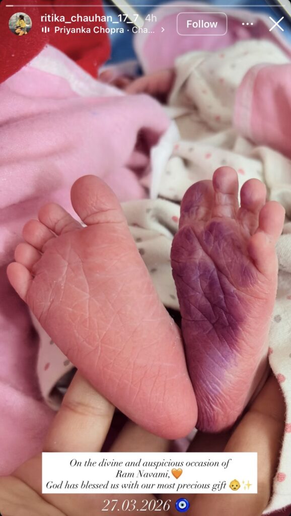 Ritika Chauhan took to her Instagram Stories to share a touching glimpse of their newborn, posting a photo of the baby’s tiny feet. She wrote, “On this divine and auspicious occasion of Ram Navami, God has blessed us with our most precious gift,” marking the special moment.